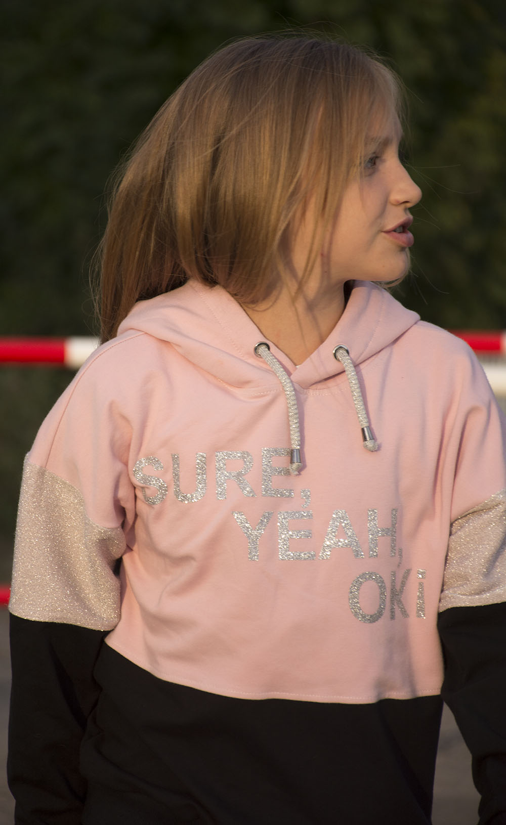Bluza „Cool” to produkt oryginalny i świetnej jakości. Zaprojektowany oraz uszyty w Polsce. Bluza to element garderoby bardzo chętnie noszony przez wszystkie dziewczynki. Piękny, ciepły kolor bluzy rozjaśni szare, jesiennno-zimowe dni. Bluza na rękawach posiada lampasy z czarnej, błyszczącej siateczki, ponadto na przodzie znajduje się piękny, brokatowy nadruk inspirowany tańcem.